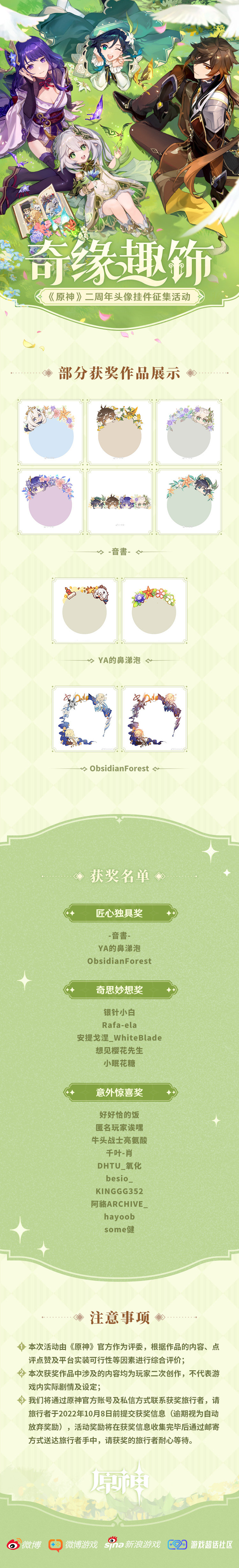 2、 活动期间内,旅行者可以参与活动,领取「奇缘趣饰」头像挂件、原神专属微博图标、派蒙评论气泡等微博饰品;