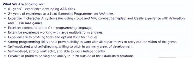 值得一提的是,在这动态的下方还附带了米哈游北美工作室的招聘链接,其中的岗位描述透露了不少信息。比如其中的开放世界首席程序员,就要求有8年以上的3A游戏开发经验,2年以上的3A游戏首席程序员经验。