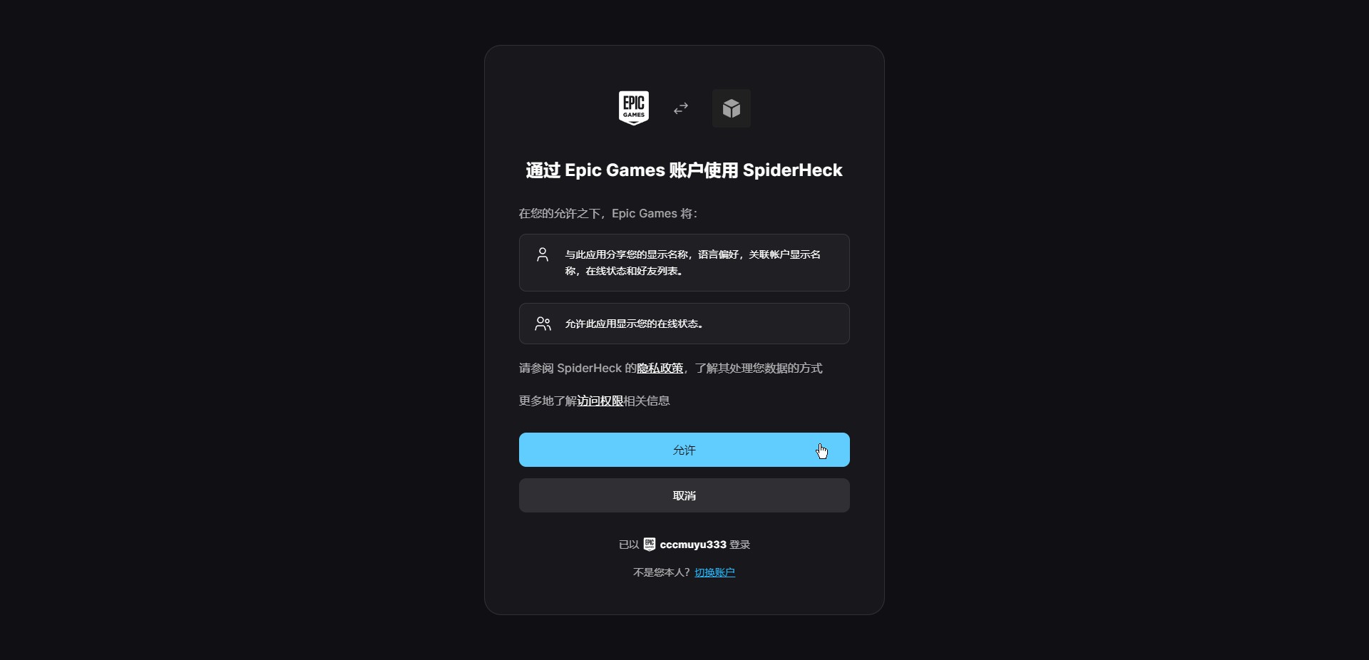 注意:游戏主界面会先自动弹到默认浏览器上,让你登陆一下epic,然后允许一下,你登录之后进到游戏中。(没有账号的话就注册一个epic账号)